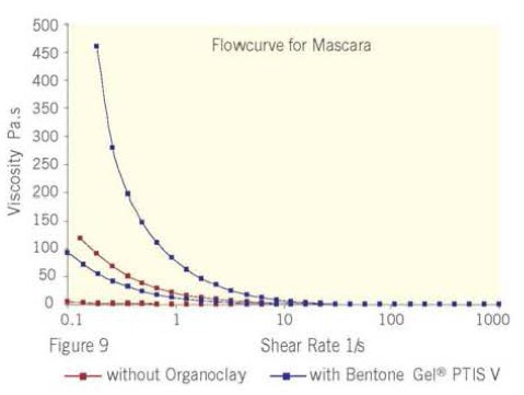 Bentone Gel PTIS V睫毛膏的流動曲線顯示低剪切粘度和觸變性增加,應(yīng)用性能增強(見圖9)。
