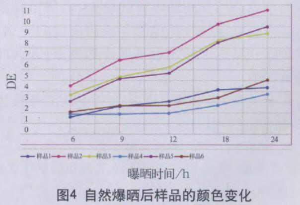 氙燈試驗室加速測試的顏色變化(DE)的值如圖 5所示。