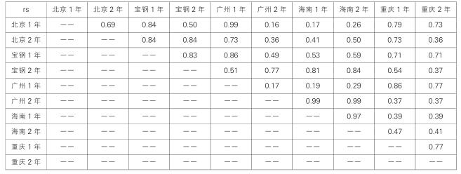 通過觀察表 5 中的數據,我們發(fā)現,戶外曝曬之間的相關系數不是很好。 即使是同一地區(qū),曝曬 1 年和曝曬 2 年的試驗結果之間的相關性也不全是好的,其中廣州 1 年與廣州 2 年之間的相關系數只有 0.17 。 不同地區(qū)之間的相關系數更是不理想,尤其是海南 1 年、海南 2 年與其它地區(qū)之間的相關系數。