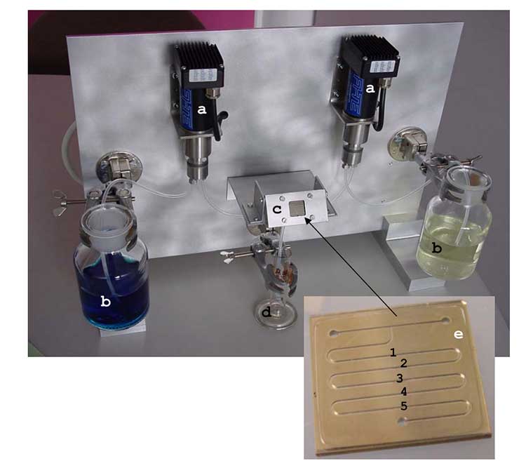 整個(gè)微型反應(yīng)器系統(tǒng)需要兩臺(tái)外部計(jì)算機(jī)來控制的微型齒輪泵(微型齒輪泵品牌:彗諾HNPMikrosysteme GmbH),確保兩種離析物的混合比例以及反應(yīng)器核心內(nèi)化學(xué)成分的平均停留時(shí)間都能達(dá)到較佳狀態(tài)。