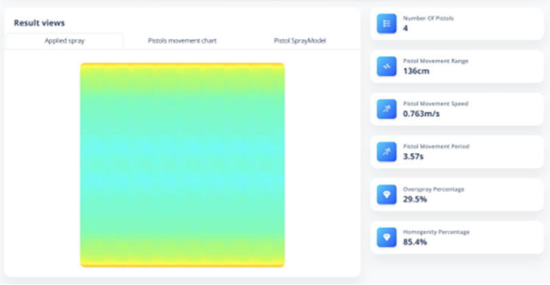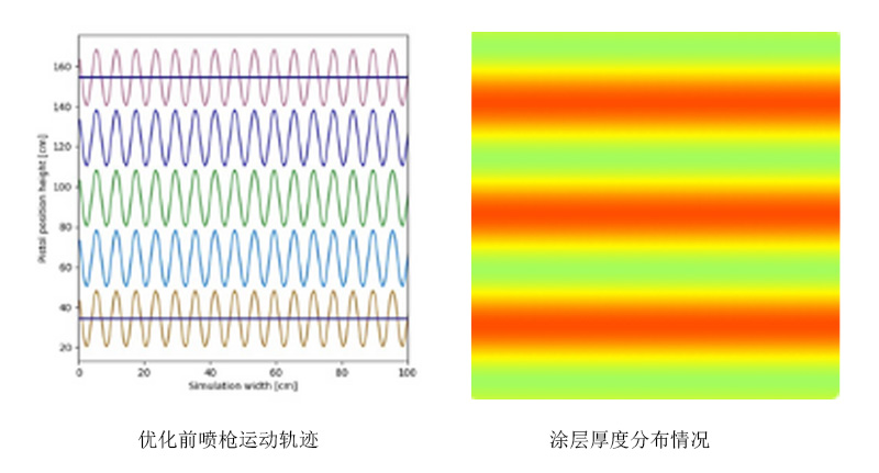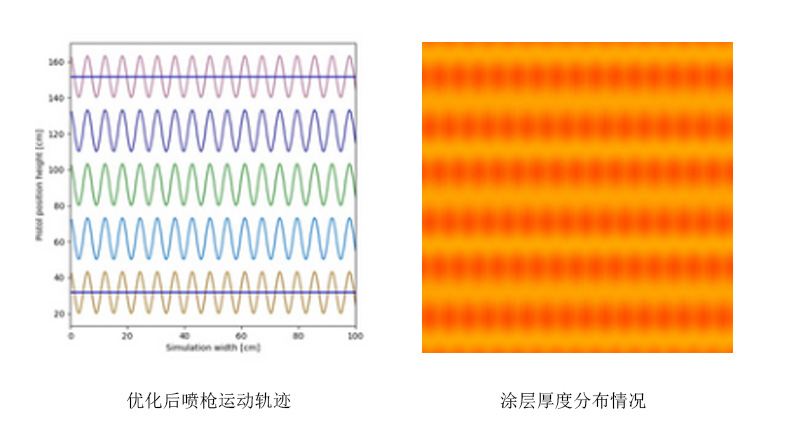 下圖是結(jié)果顯示界面,軟件幾分鐘內(nèi)優(yōu)化噴槍關(guān)鍵參數(shù),如噴槍移動范圍、噴槍移動速度、噴槍移動時間等,以及涂層噴涂效果圖形可視化,量化涂層均勻性。